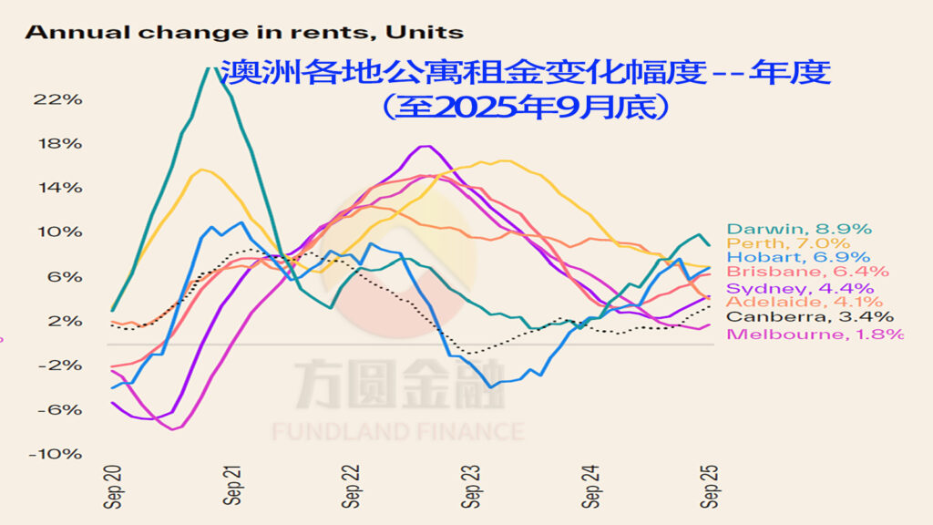 - 城市表现:达尔文租金季度上涨 2.9% 居首,霍巴特 1.9%,珀斯 1.7%。悉尼与墨尔本租金涨幅相对温和。