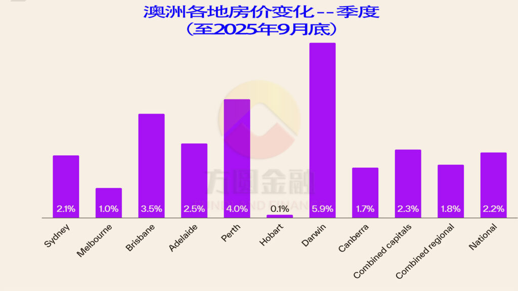 - 季度表现:9月季度全澳房价上涨 2.2%,高于6月季度的1.5%,几乎是今年一季度增幅的两倍。换算为金额,相当于每套房产中位价上涨 $18,215。