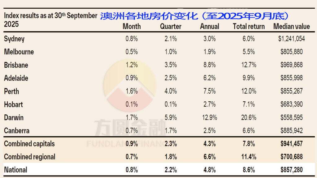 进入春季,澳洲房产市场加速升温。Cotality 房价指数(HVI)显示,2025年9月全澳住宅价值环比上涨 0.8%,创下自2023年10月以来的最强单月涨幅。其中,首府城市房价表现尤为突出,整体上涨 0.9%。