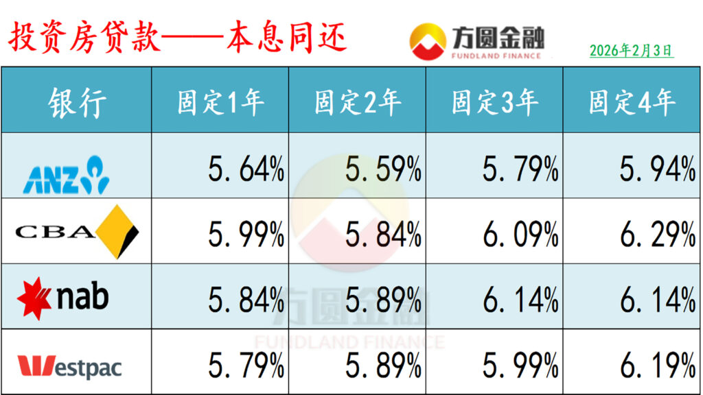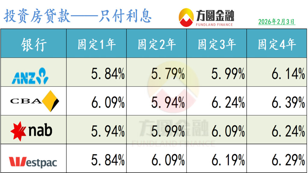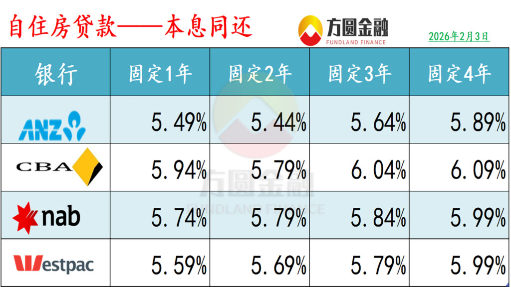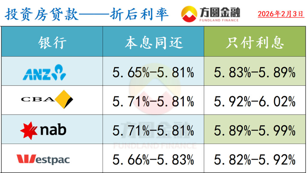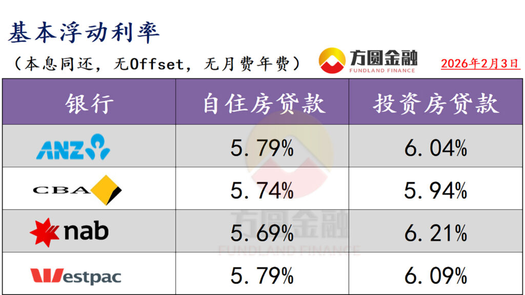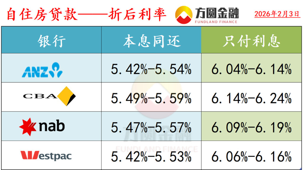 :有关数据统计至2026年2月3日。以下浮动“折后利率”和“固定利率”(ANZ,NAB除外)均为使用相关银行套餐(Package)后的优惠利率,且贷款金额以50万元,贷款比例以80%为例。