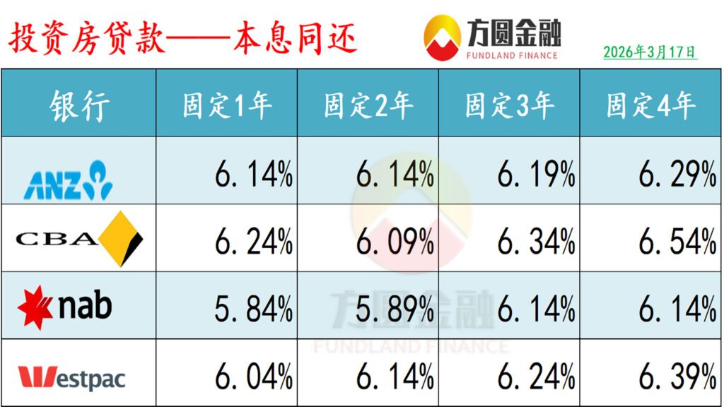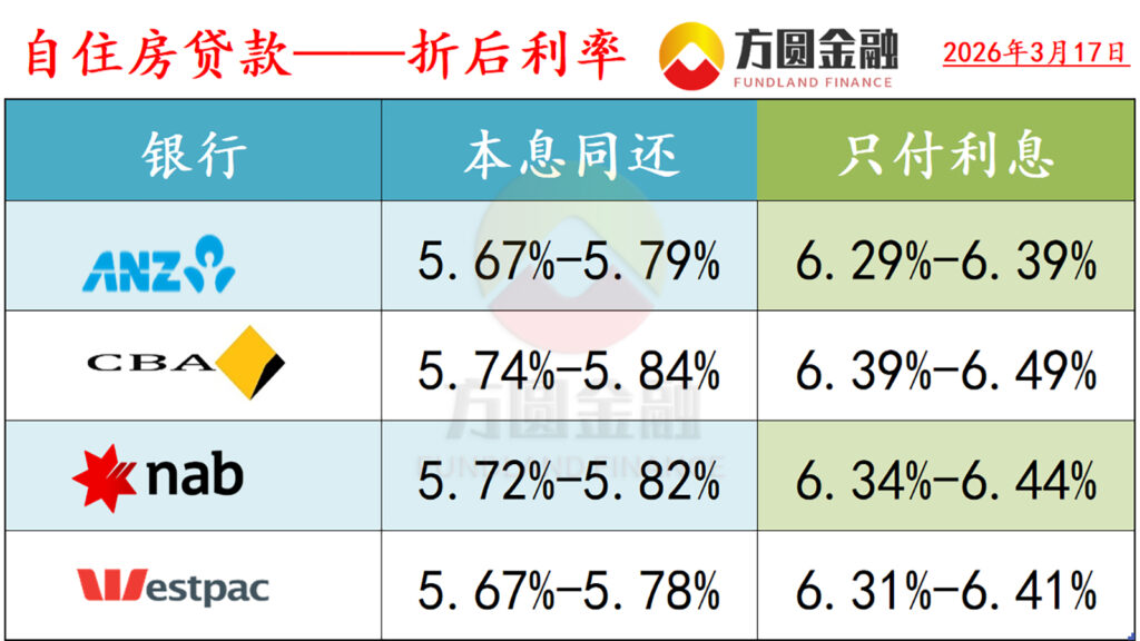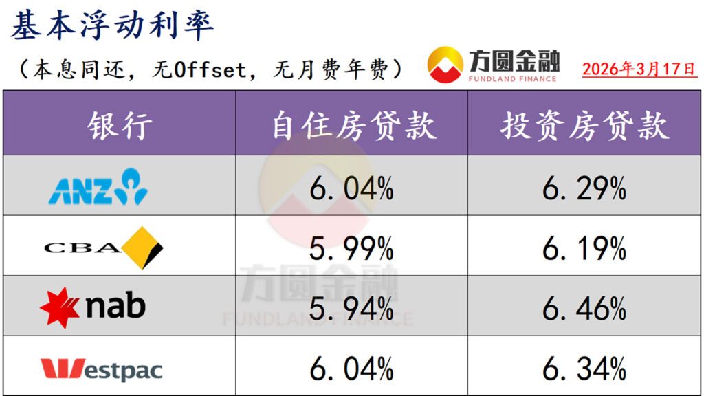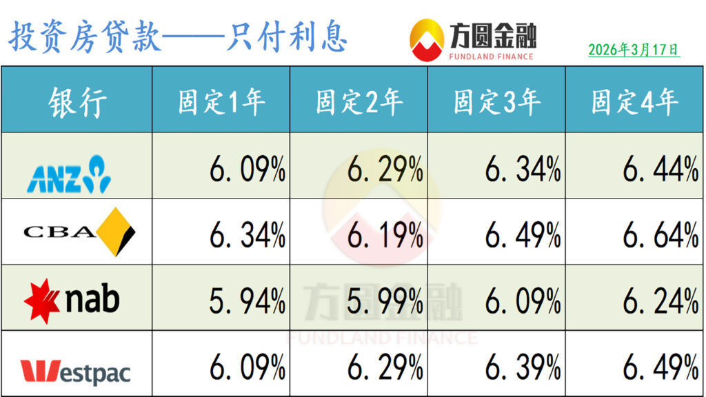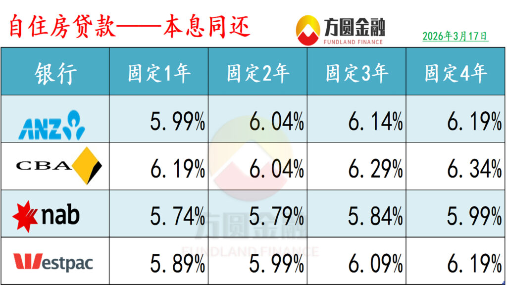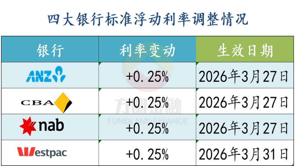 澳洲四大银行已宣布全额跟进加息幅度,并将分别在3月27日和31日生效。四大行早在1-2月份均提前上调了固定利率。